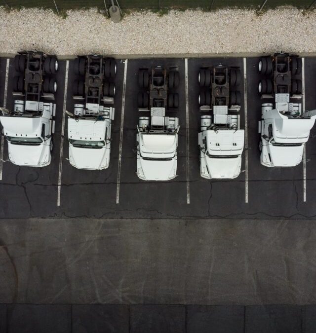 Fleet of white 18-wheeler semi-trucks overhead view drone photog