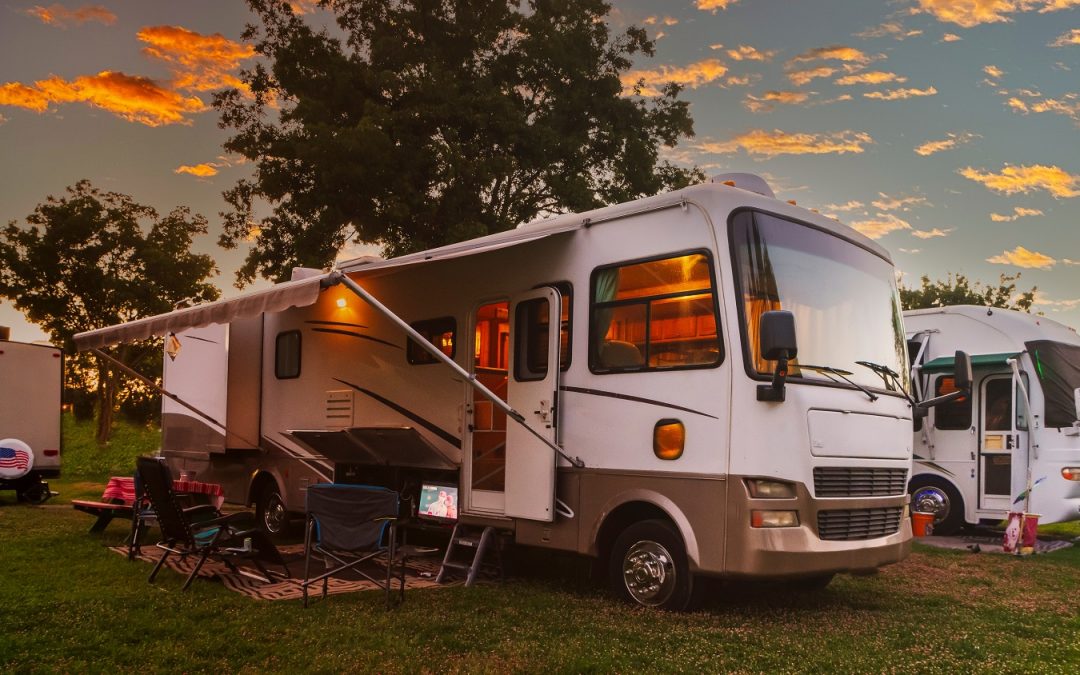 Sun going down at the Rv park with lights on the motor home