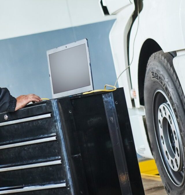 Truck repair service. Mechanic makes computer diagnostic of the semitruck